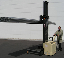 - Moving mast allows ground level stacking or low height of bottom level rack beam